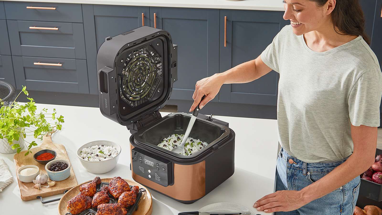 De Rapid Cooker-stand (snelkoken) combineert stoom met airfryen voor heerlijk luchtige granen of al dente pasta, malse groenten en krokante hoofdgerechten, tegelijkertijd!